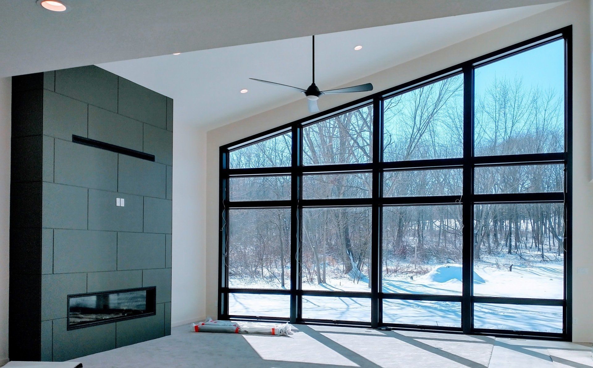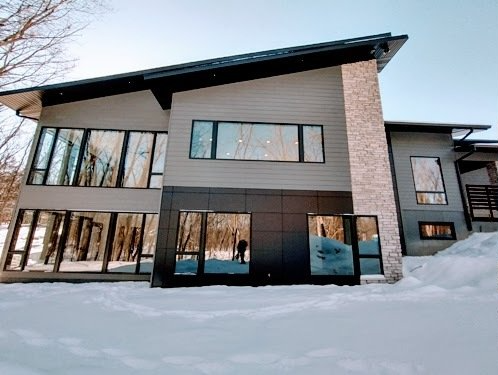 A modern 2-story custom home design in the Cedar Valley, Kerisman Studios collaborated with Klunder Homes Inc. by contributing the roofline, window design, exterior material selection and color, and helped coordinate interior finishes of paint, flooring and countertops, etc.