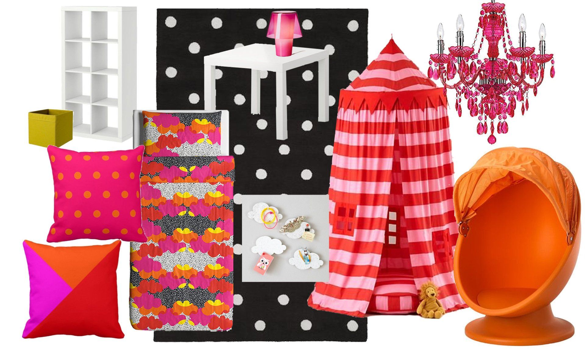 A master bedroom in yellow, teal, and gray featuring re-purposed heirloom furniture, custom canvases, custom paint application, rug and finishing touches; a girl's room in black, white, pink, and orange featuring fanciful drapery, lighting, and rug, bunk beds and bedding, reading nook, and play tent; and an out-of-this-world boys room featuring a climbing wall, custom space artwork, a hanging reading chair, astronaut bedding, NASA rug, and rocket play tent.