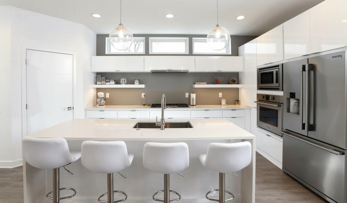 A modern 2-story custom home design in the Cedar Valley, designed by LGC Homes and built by Klunder Homes Inc. Kerisman Studios contributed exterior material colors, interior finishes of flooring and countertops, lighting plans, and catwalk feature. Photos courtesy of Waterloo-Cedar Falls Courier.