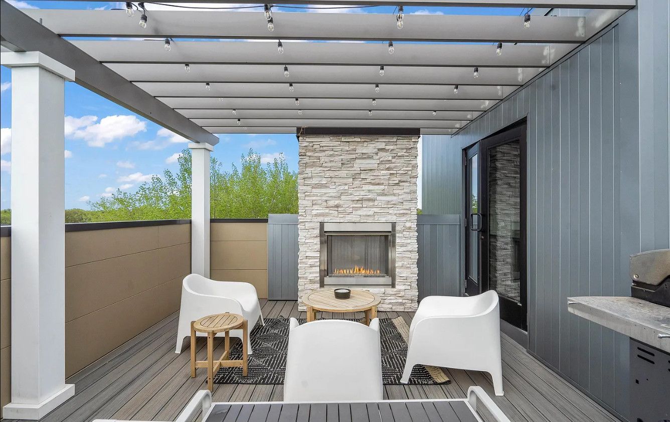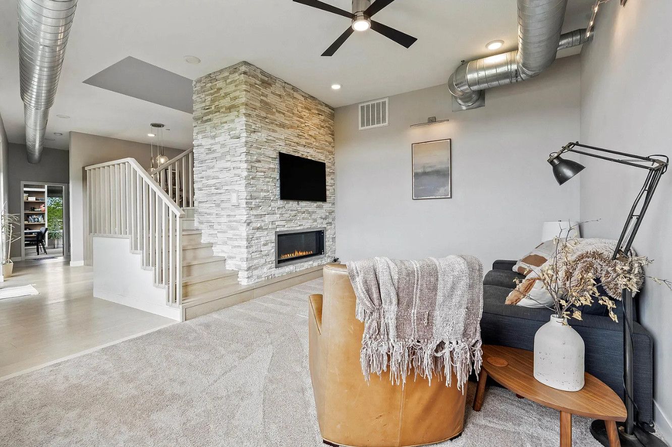 A modern custom apartment in downtown Cedar Falls, Kerisman Studios collaborated with Slingshot Architecture by contributing the staircase design with custom built in storage and stone wrapped central column, and material selections throughout the space with white oak flooring, marble look tile, and cambria countertops, paint colors, and some lighting.