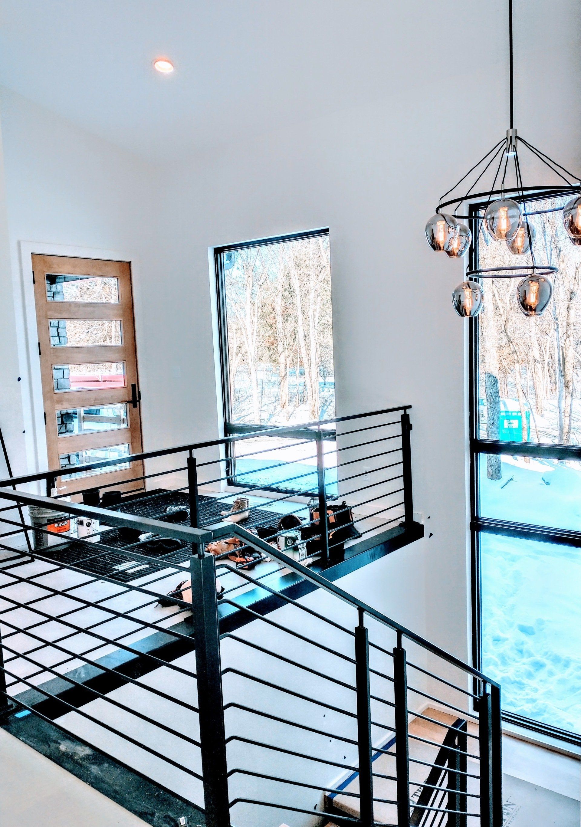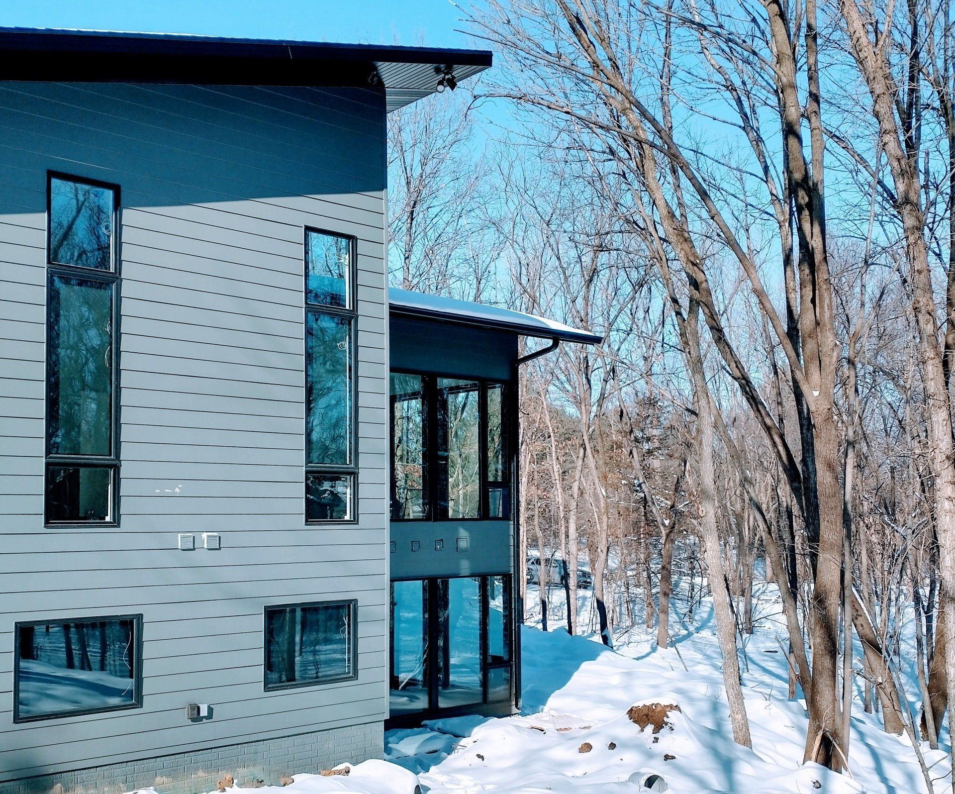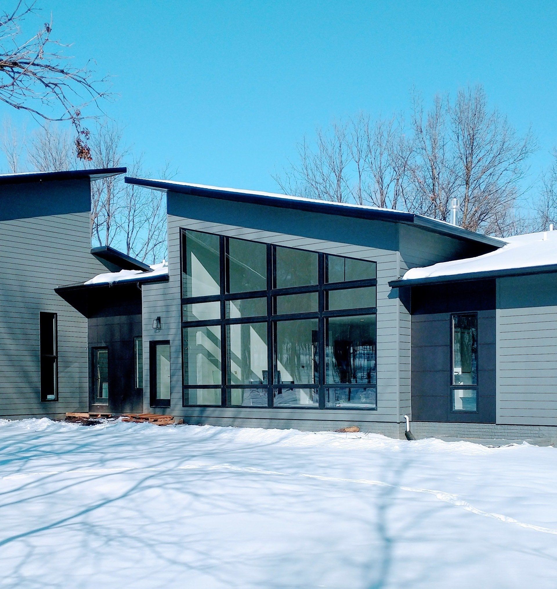 A modern 2-story custom home design in the Cedar Valley, Kerisman Studios collaborated with Klunder Homes Inc. by contributing the roofline, window design, exterior material selection and color, and helped coordinate interior finishes of paint, flooring and countertops, etc.