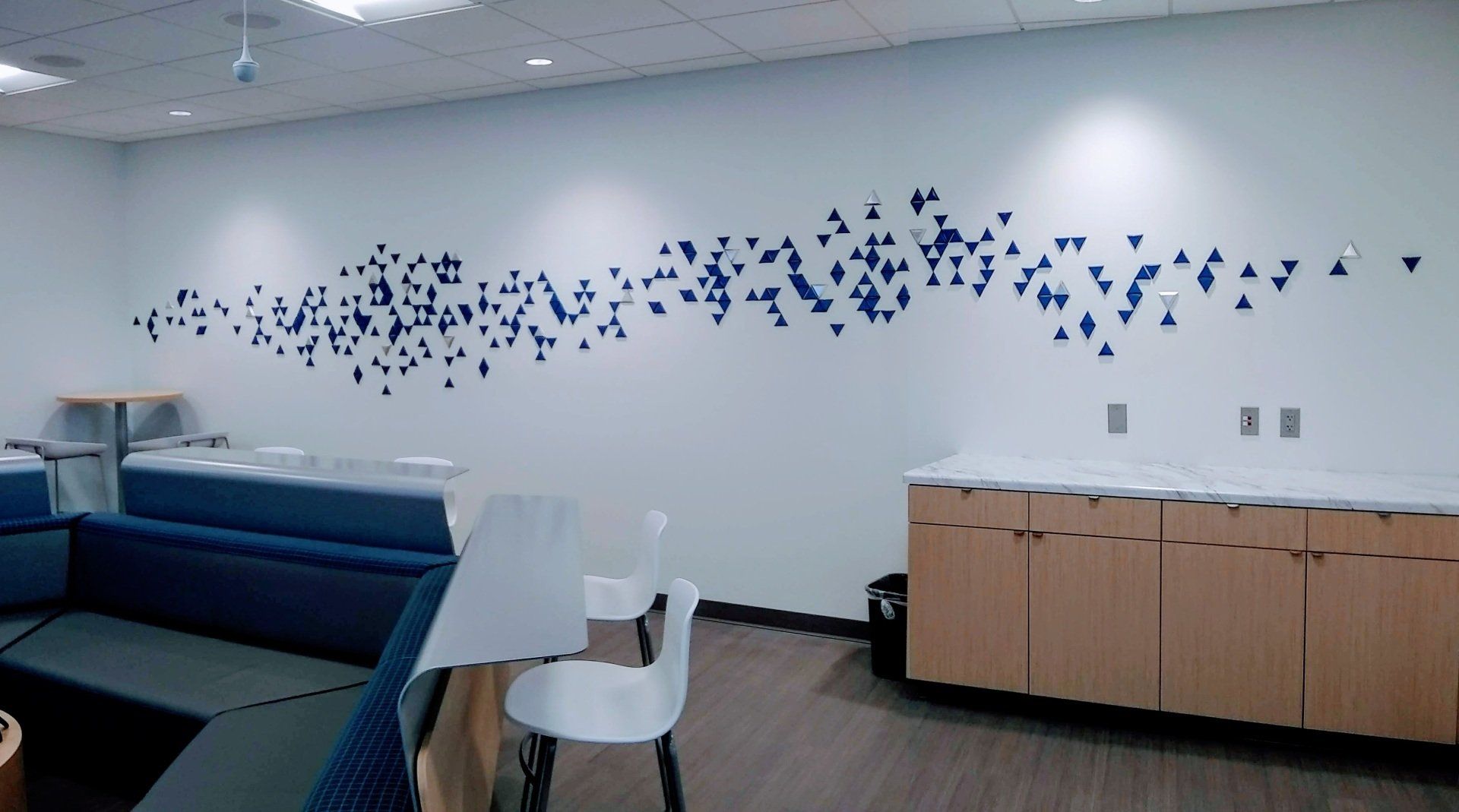 Kerisman Studios created and installed a corporate art piece called a "Flock of Triangles", for The Accel Group in Waverly. Inspired by their logo, the 3D triangles were crafted from around 300 jewelry sorting trays in aluminum and painted blue, and arranged in a flock pattern. Faux palms with geometric planters, and aluminum troughs of succulents were added to their corporate decor.