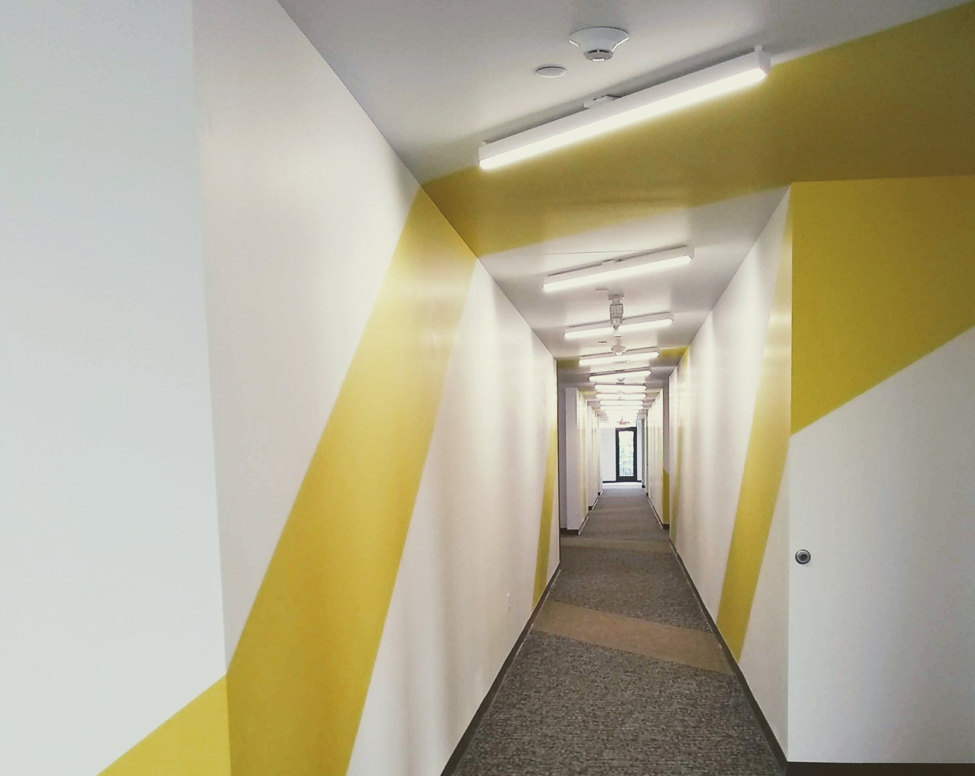 Kerisman Studios partnered with Slingshot Architecture and Eagleview Partners on a Mixed-Use 4-story building in downtown Cedar Falls. The building contains shops on the first floor, offices on the second, and residential units on third and fourth floors. Kerisman Studios assisted with floorplan adjustments, all interior materials selections, lighting and lighting plans, custom stairs, color scheme and paint designs, and custom signage.