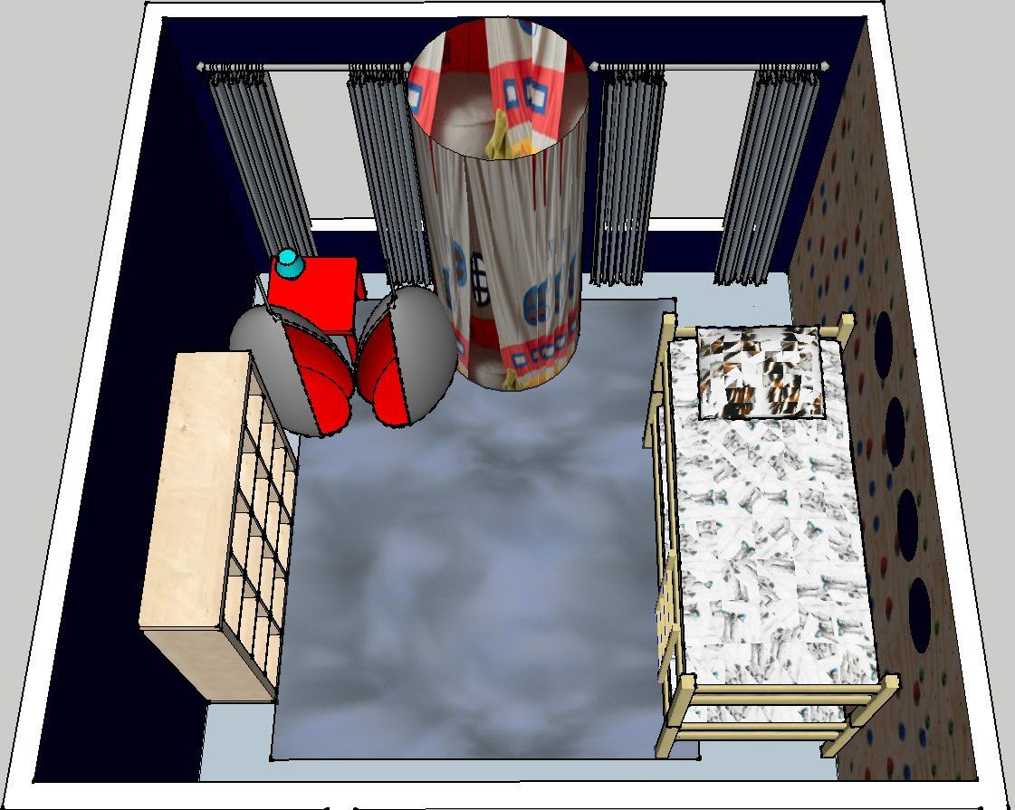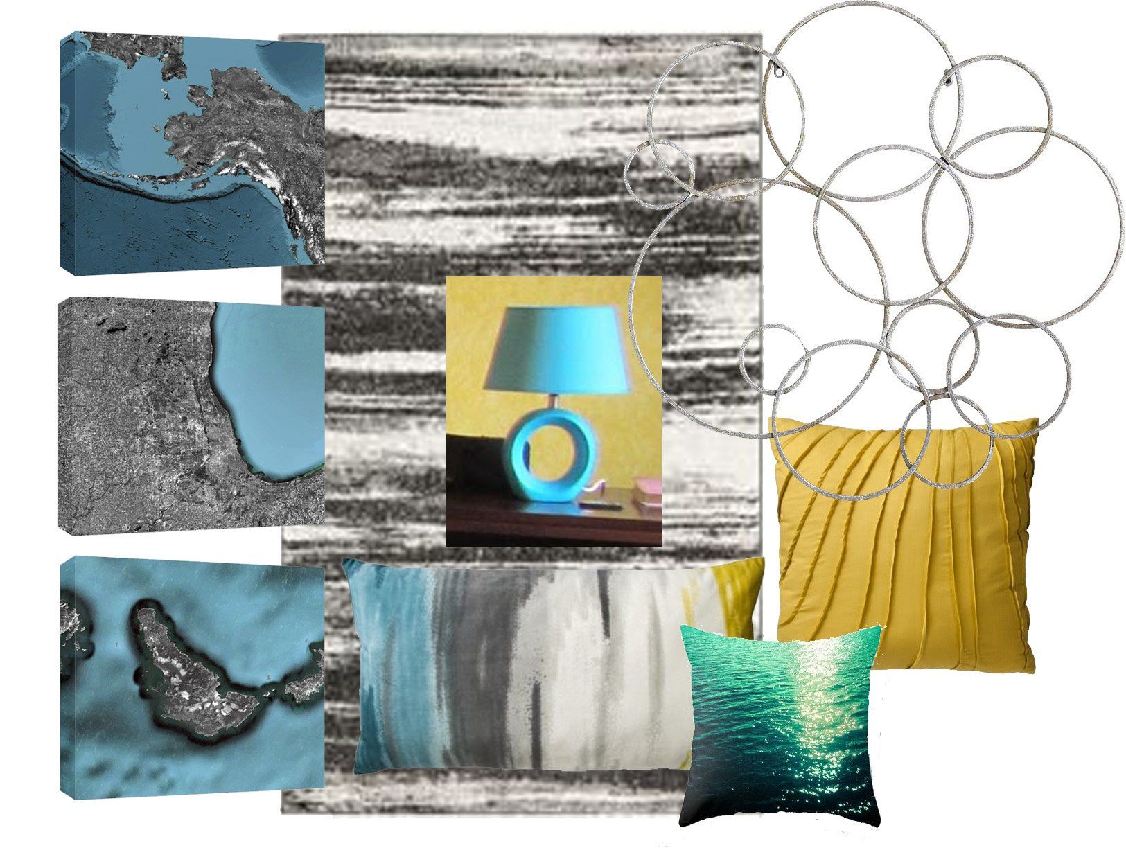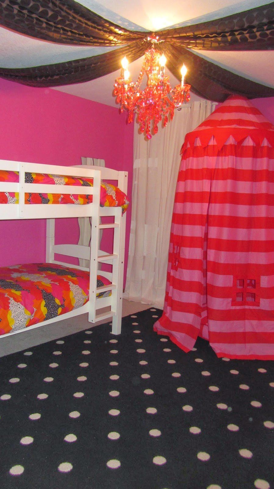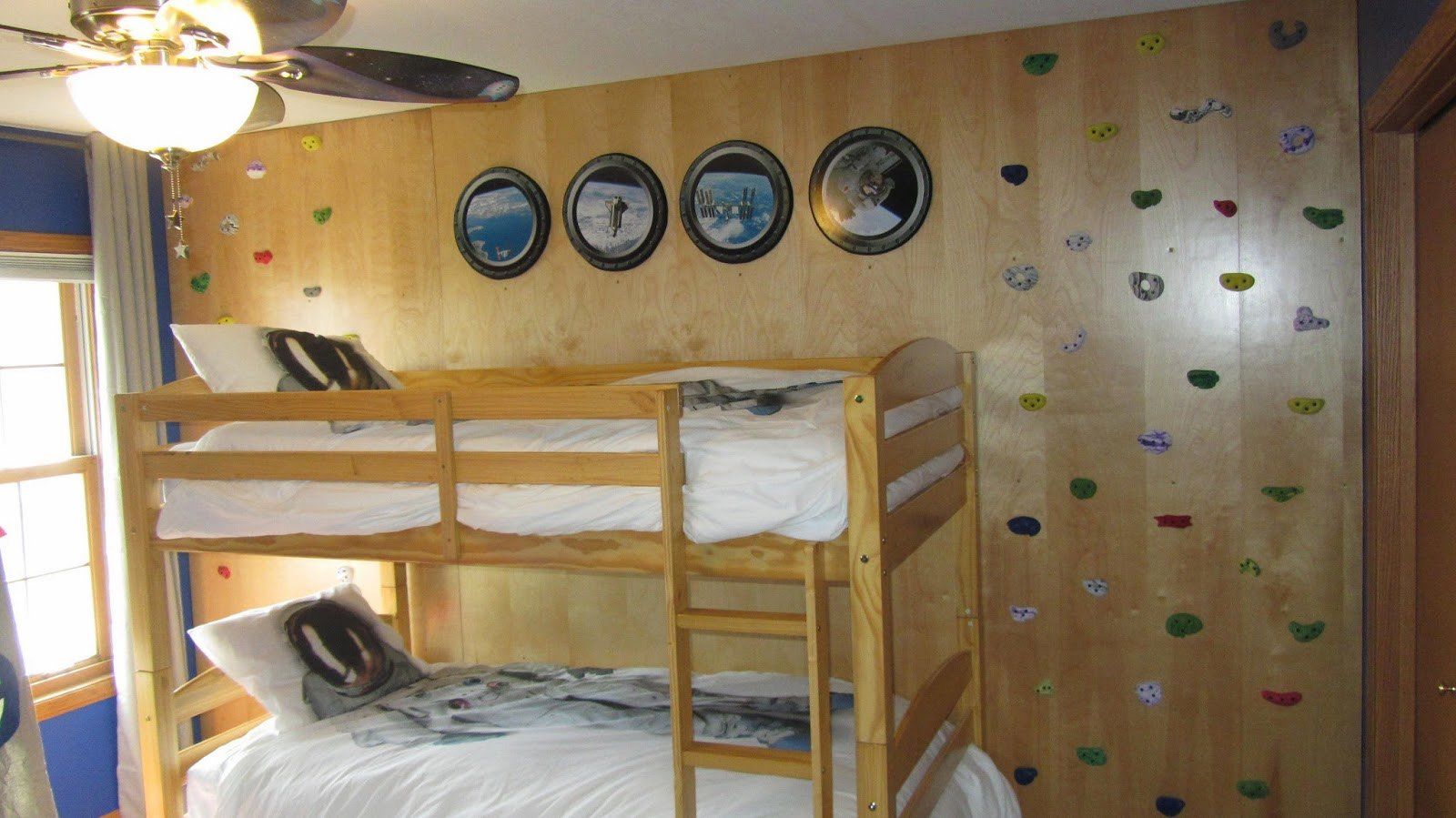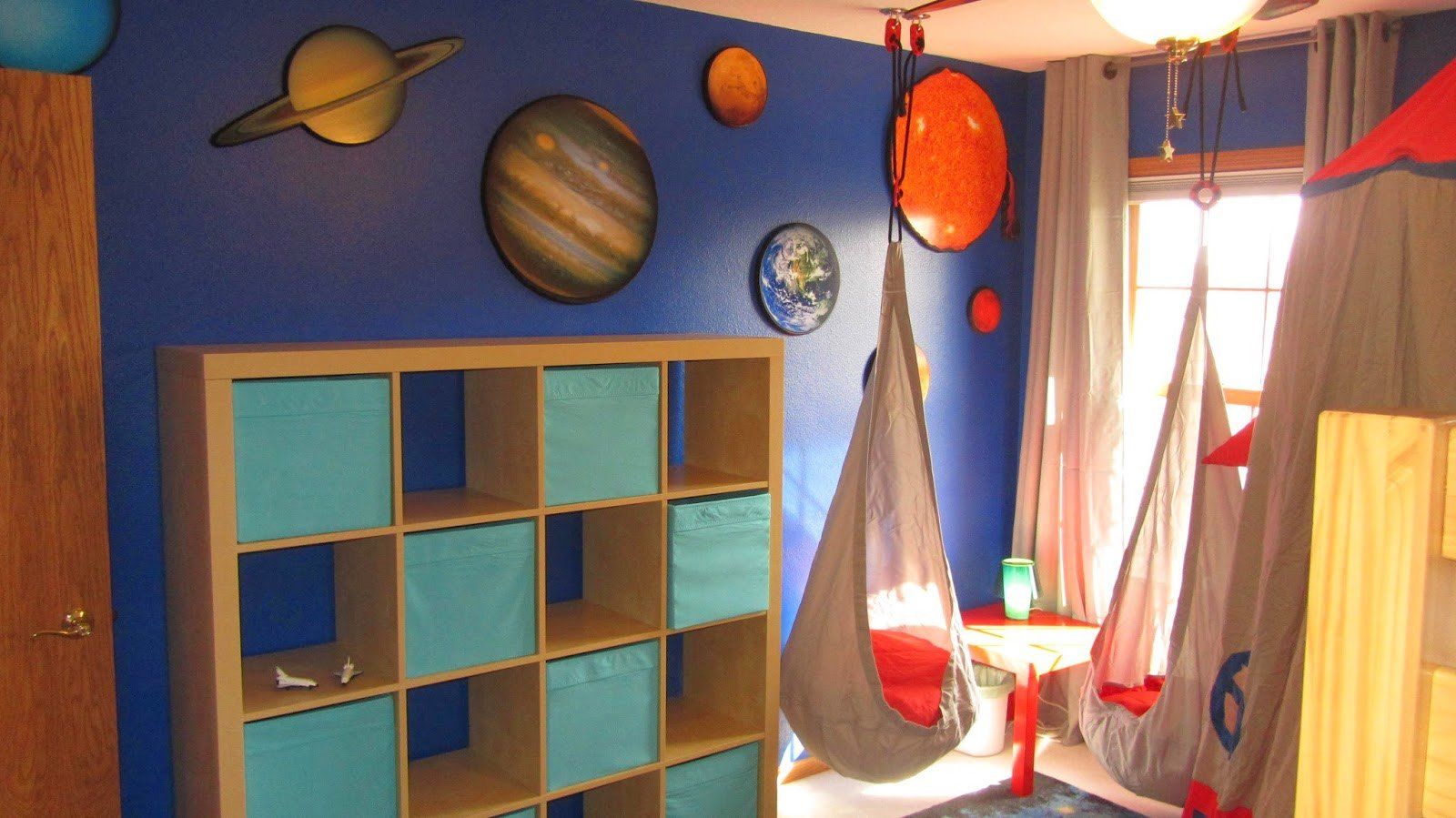 A master bedroom in yellow, teal, and gray featuring re-purposed heirloom furniture, custom canvases, custom paint application, rug and finishing touches; a girl's room in black, white, pink, and orange featuring fanciful drapery, lighting, and rug, bunk beds and bedding, reading nook, and play tent; and an out-of-this-world boys room featuring a climbing wall, custom space artwork, a hanging reading chair, astronaut bedding, NASA rug, and rocket play tent.