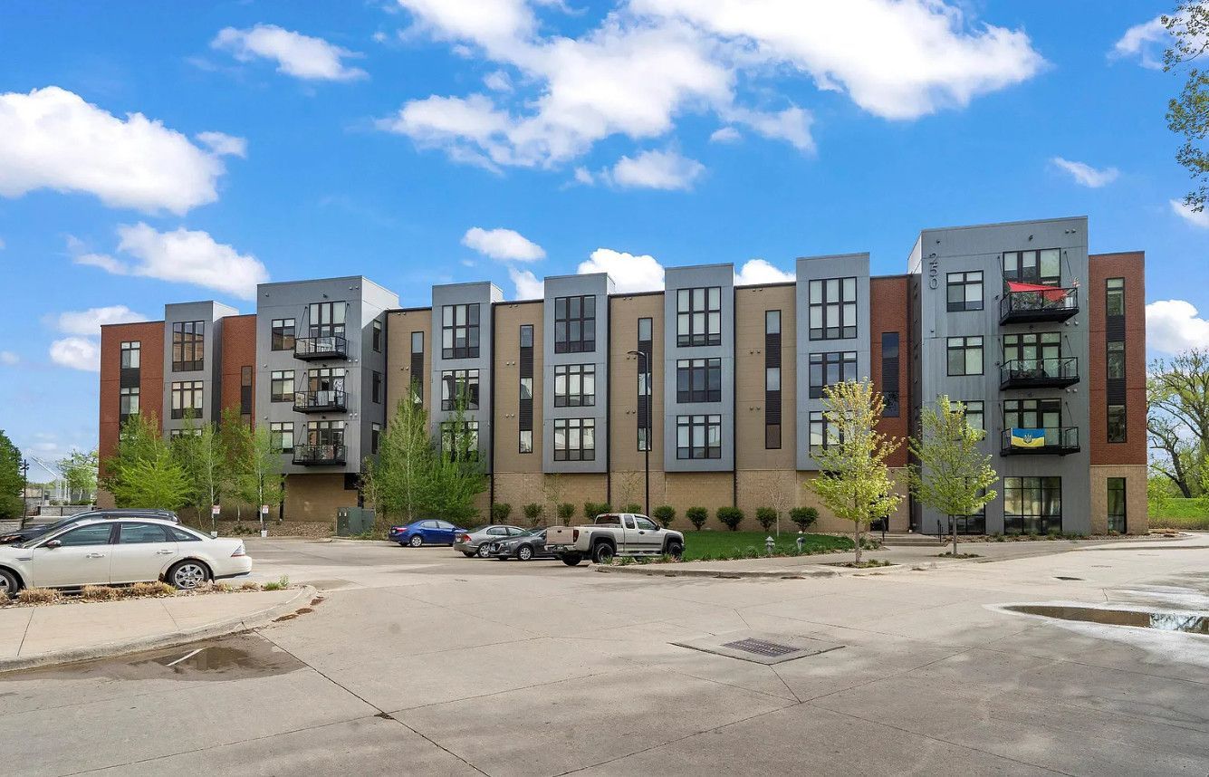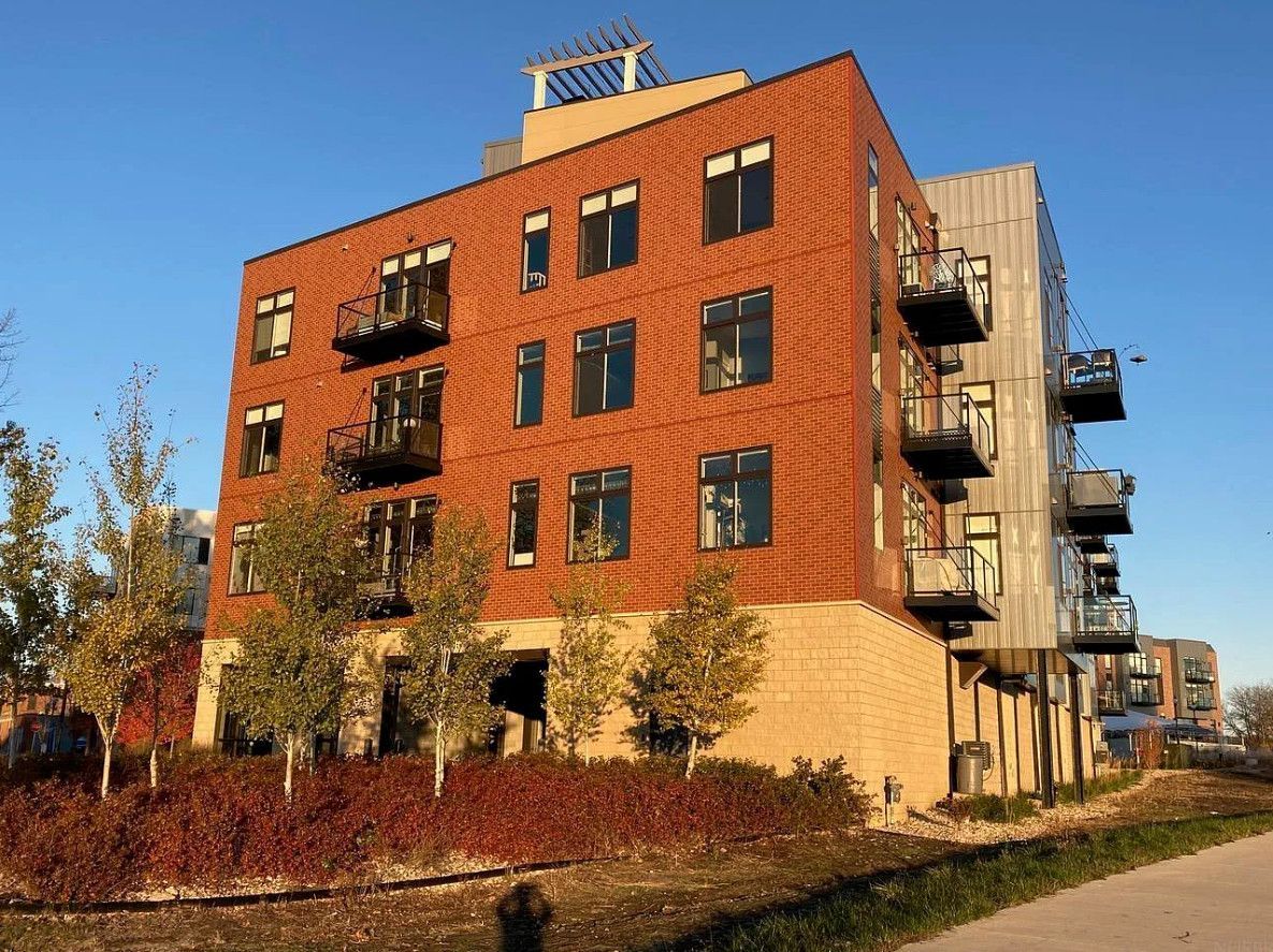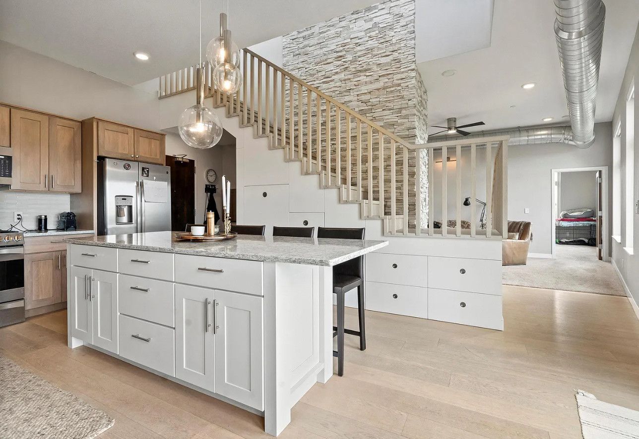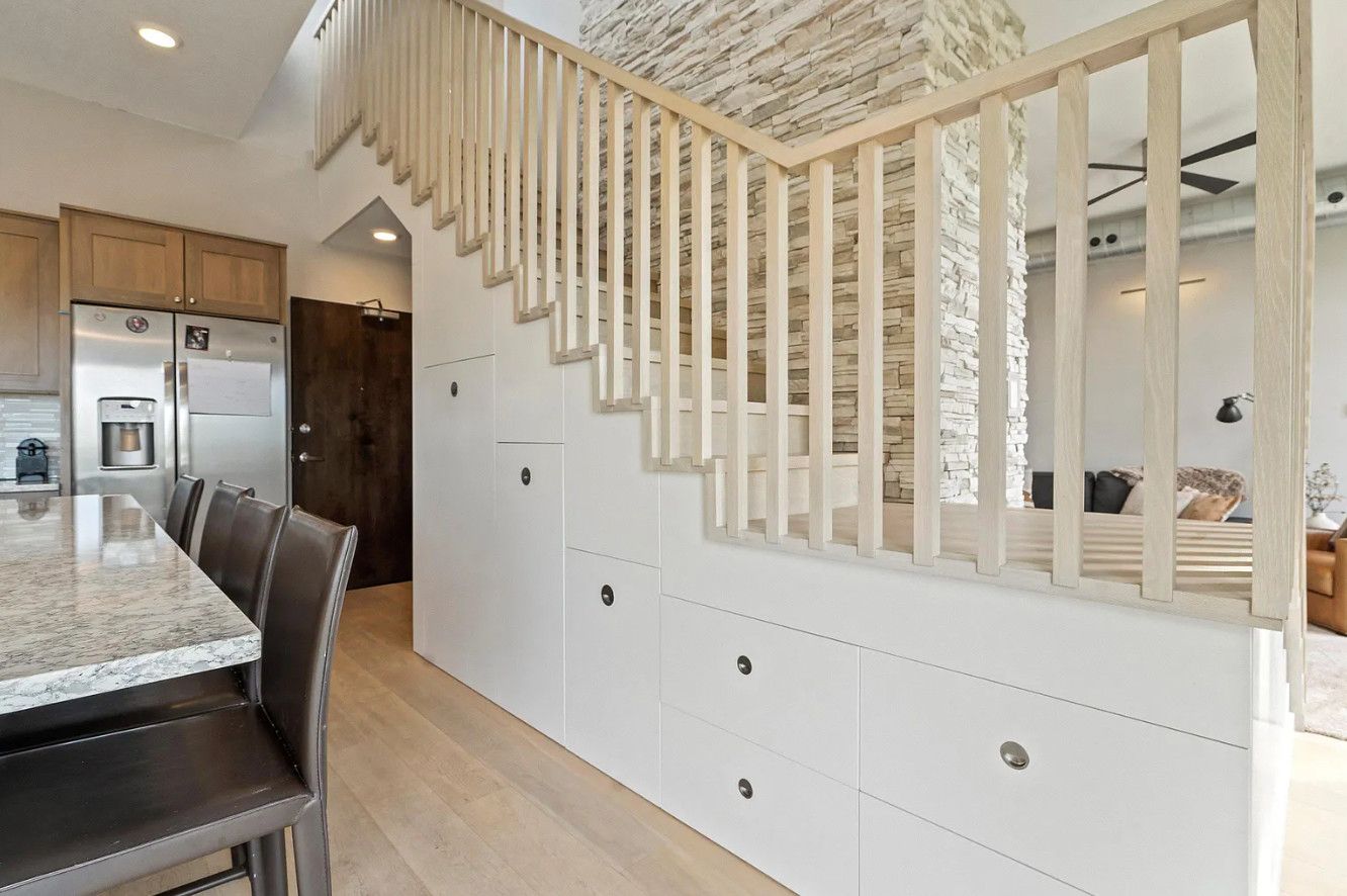 A modern custom apartment in downtown Cedar Falls, Kerisman Studios collaborated with Slingshot Architecture by contributing the staircase design with custom built in storage and stone wrapped central column, and material selections throughout the space with white oak flooring, marble look tile, and cambria countertops, paint colors, and some lighting.