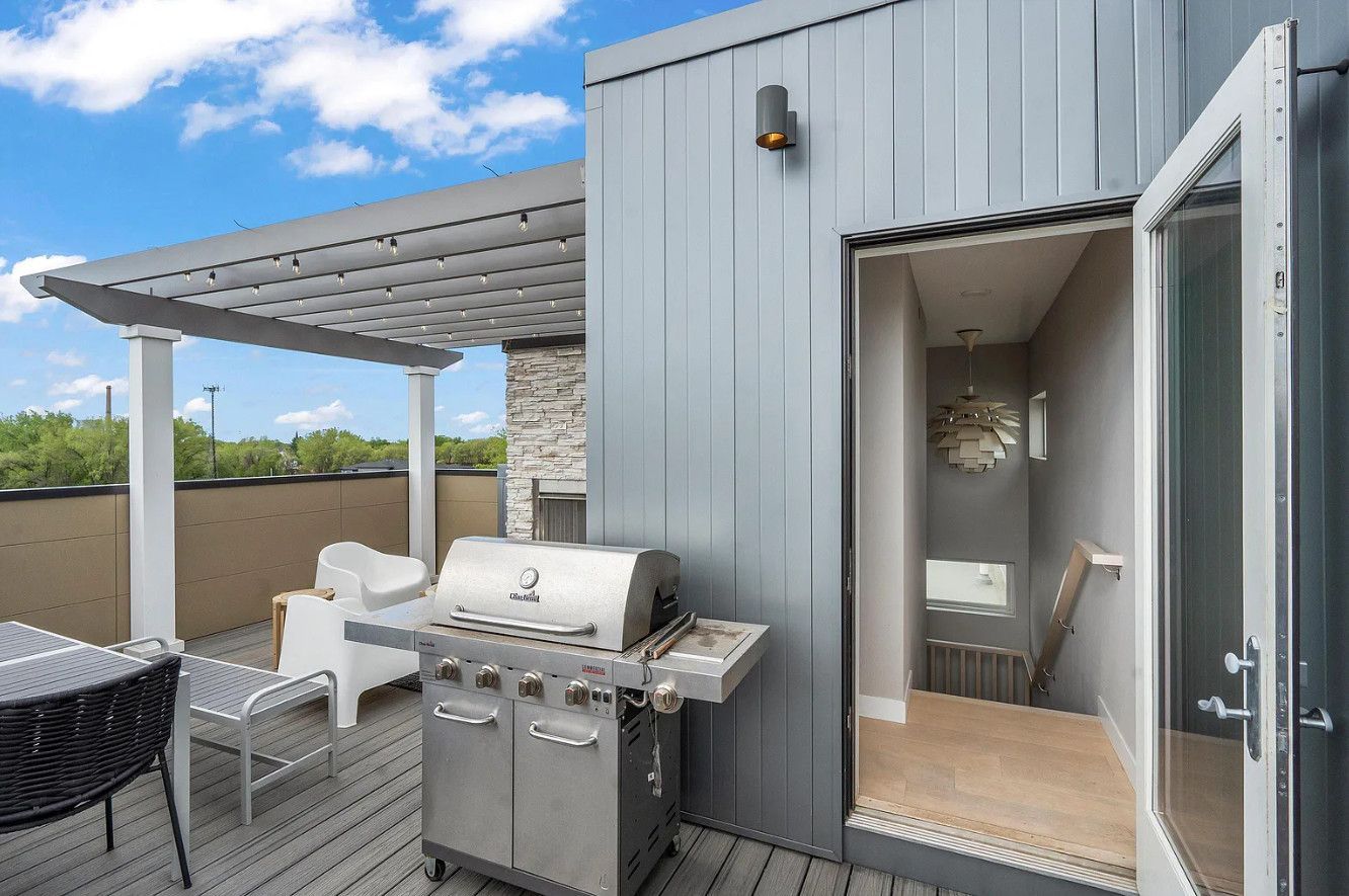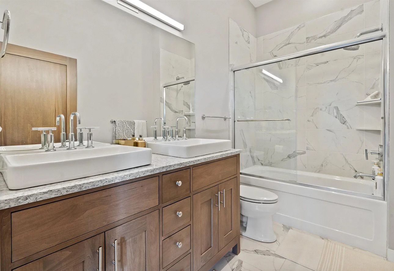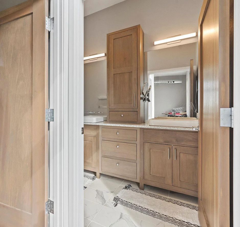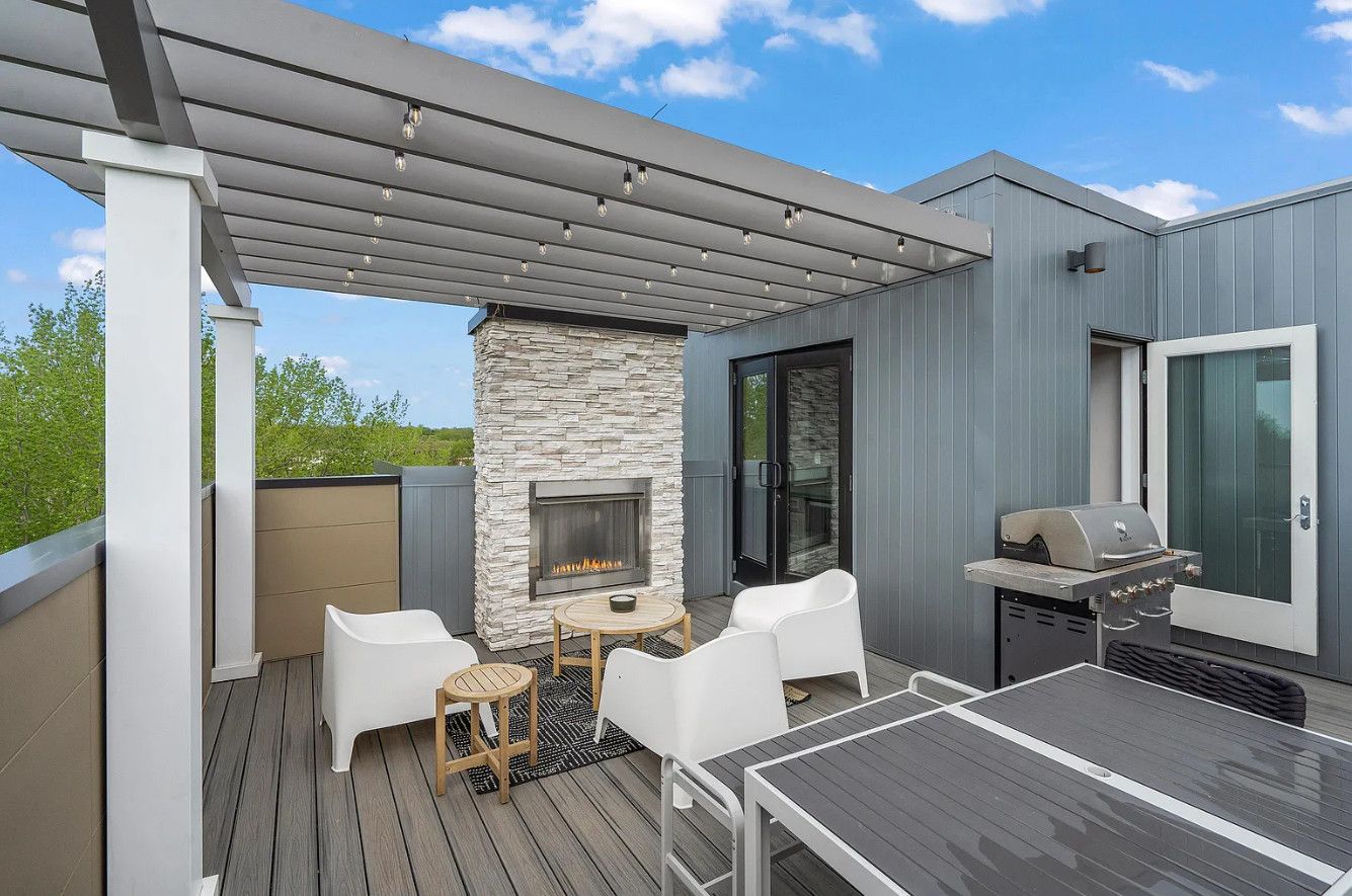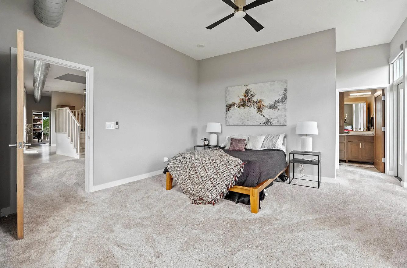 A modern custom apartment in downtown Cedar Falls, Kerisman Studios collaborated with Slingshot Architecture by contributing the staircase design with custom built in storage and stone wrapped central column, and material selections throughout the space with white oak flooring, marble look tile, and cambria countertops, paint colors, and some lighting.